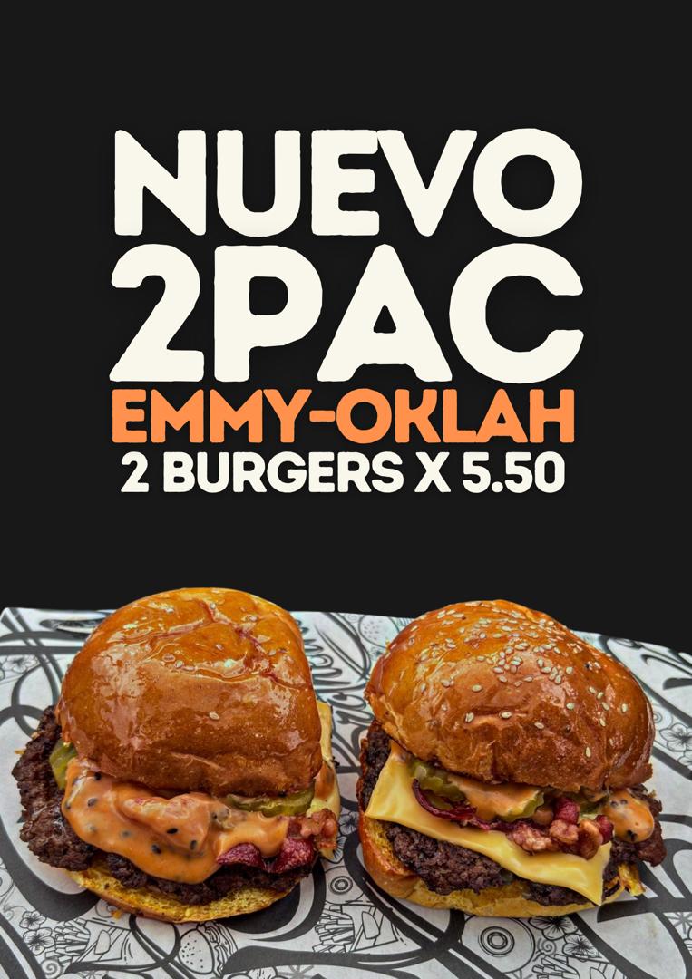 Promo de 2 Hamburguesas con SMASH PATTY estilo OKLAHOMA, queso americano, salsa EMMY, pepinillo y tocineta. RECOMENDACIÓN: (1) Promo por persona (no limitativo) *Si deseas una especificación particular para tu pedido, hazlo saber en el espacio de 'comentarios al chef'.